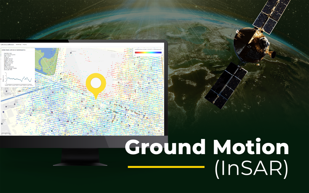1 . Ground Motion (InSAR) – เทคโนโลยีการประมวลผลข้อมูลจากดาวเทียมความละเอียดสูง สามารถเก็บข้อมูลในพื้นที่บริเวณกว้าง หรือครอบคลุมทั้งประเทศไทย และสามารถนำข้อมูลไปวิเคราะห์ ตรวจสอบและแสดงผลการเปลี่ยนแปลงของพื้นดิน และโครงสร้างขนาดใหญ่ ซึ่งจะสามารถเลือกได้ตามช่วงเวลาที่กำหนด หรือย้อนหลังสูงสุดถึง 8 ปี และเฝ้าติดตามการเคลื่อนตัวในทุกๆ 12 วัน ซึ่งข้อมูลแสดงผลผ่านทางระบบ Ground Motion Service ผ่านระบบออนไลน์